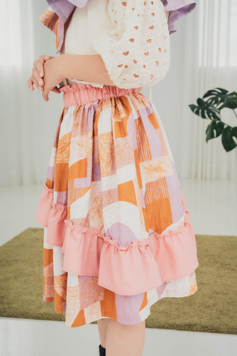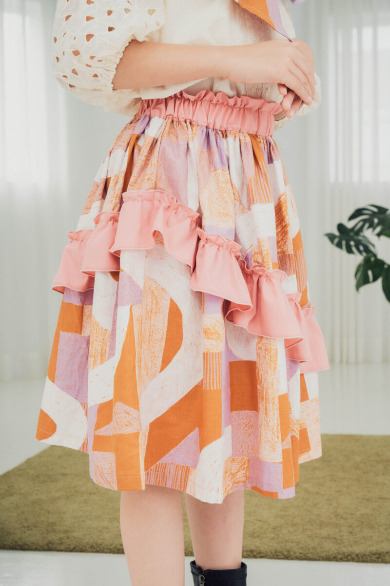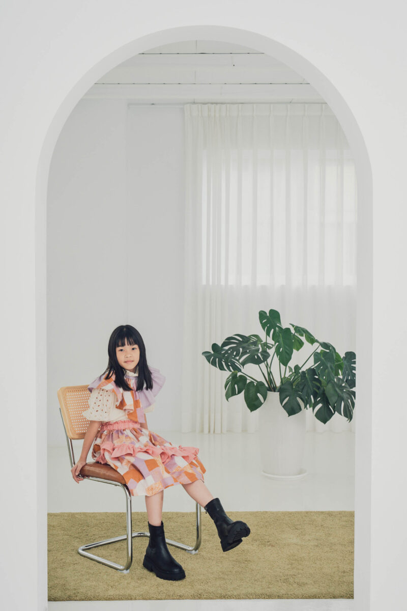 女童的短裙以荷葉做為亮眼的視覺設計,以斜邊的設計,增加了視覺層次感,讓整體造型更顯俏皮與可愛。