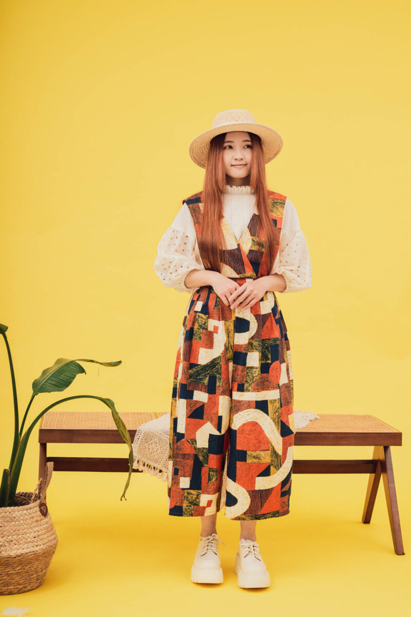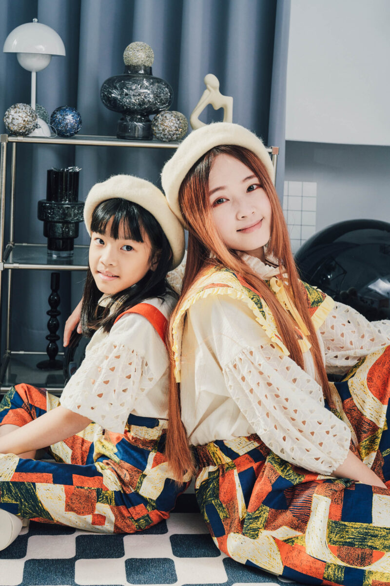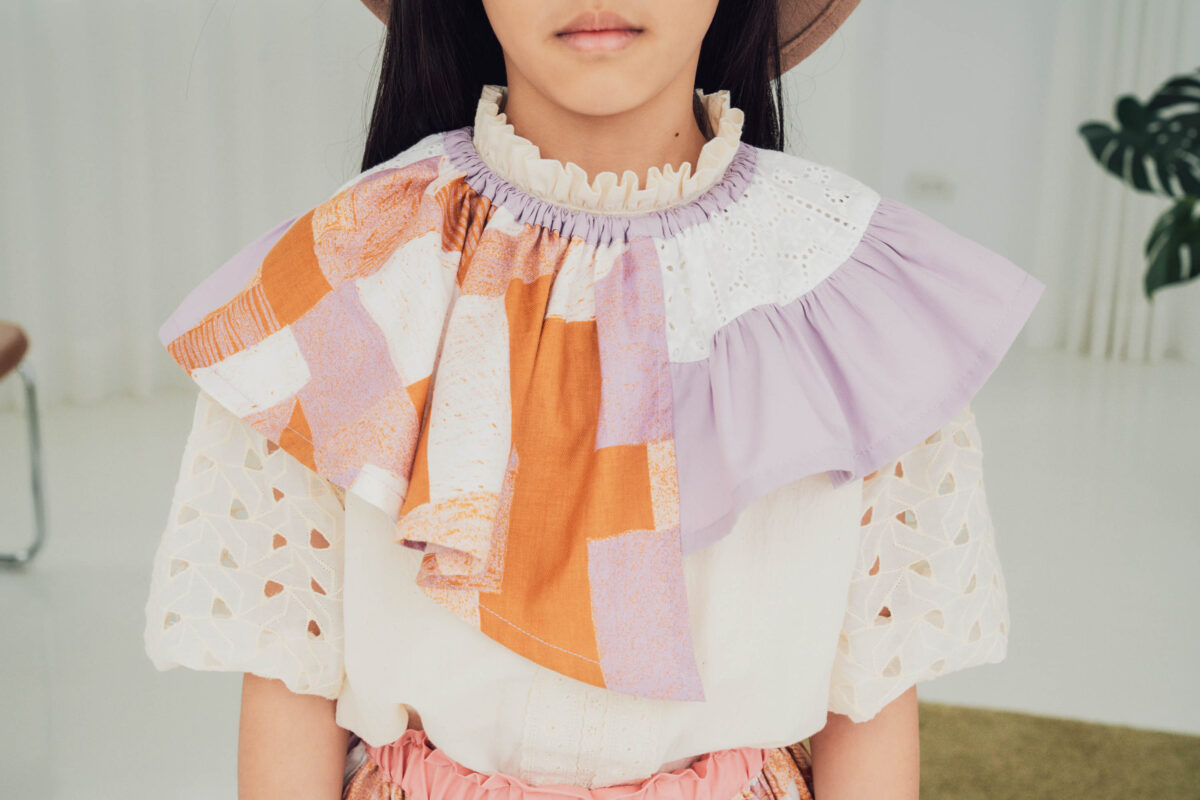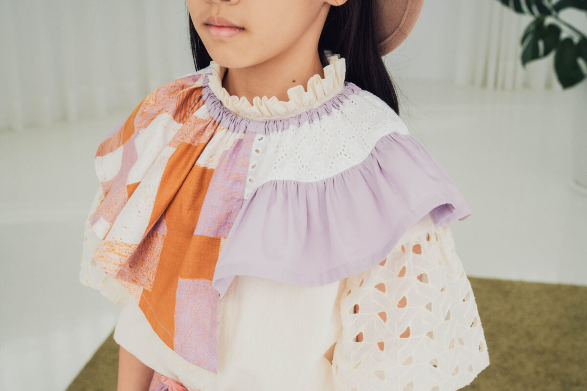 女童的短裙以荷葉做為亮眼的視覺設計,以斜邊的設計,增加了視覺層次感,讓整體造型更顯俏皮與可愛。