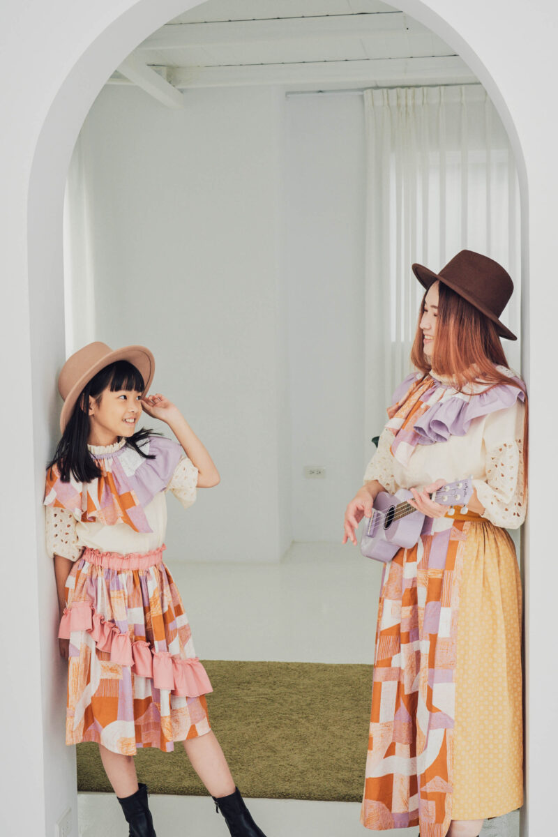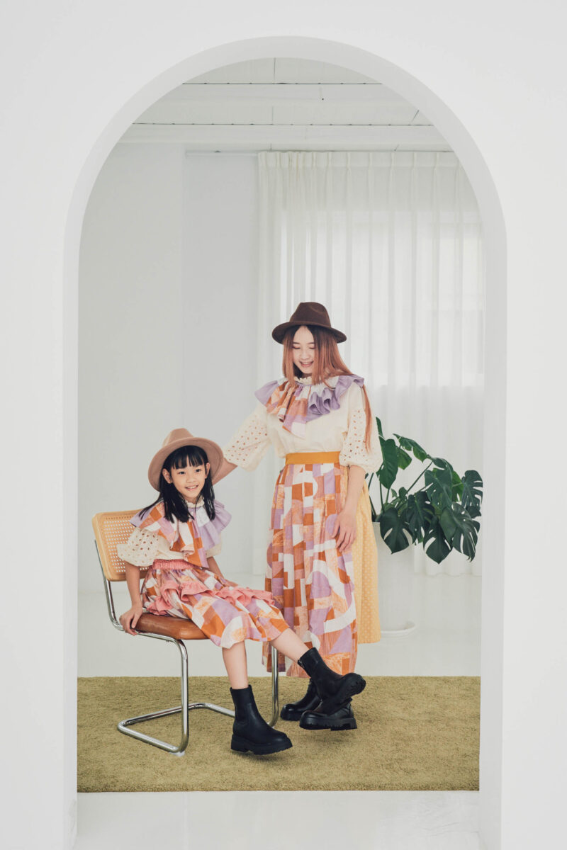 粉色設計上更為柔和,選擇裙裝設計,大人款式為拼接長裙,裙擺長短不一致,添加一絲個性設計,側邊布花與背後素面布的低調,不搶走主布的光彩。